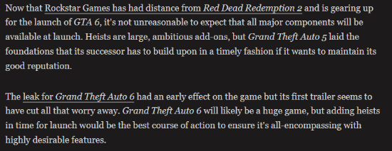 作者表示《GTA6》已经让大家等待了十多年,随着期望值的不断上升,R星需要在游戏发布初期保证它是“完整的作品”,以保持良好的声誉。