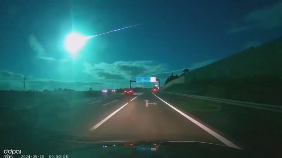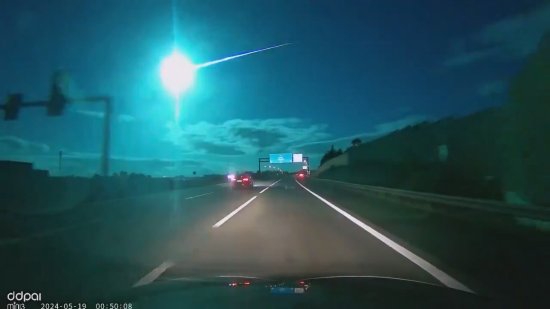 当地时间5月19日,葡萄牙和西班牙上空发现流星,当地不少路人和行车记录仪纷纷记录下了这颗蓝色流星划破夜空的震撼一刻,蓝绿色的灯光照亮附近的大地。