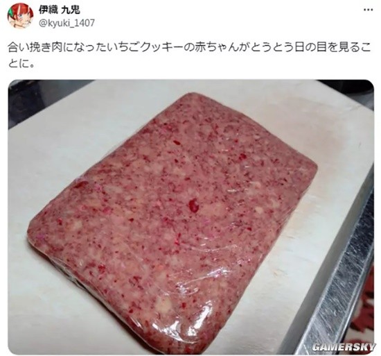 「总算有机会分享我做的,宛如绞肉的草莓饼干面团了。」