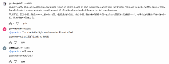 有网友根据汇率猜测,游戏在国外发售时将是40美元,但该说法被其他网友反驳,称中国大陆是Steam上的低价地区,而高价区游戏应该售价60美元左右。