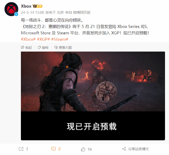 Xbox官方发微宣布,《地狱之刃2》现已开启预载。本作将于5月21日首发登陆Xbox Series X|S、Microsoft Store及Steam平台,并首发同步加入XGP!