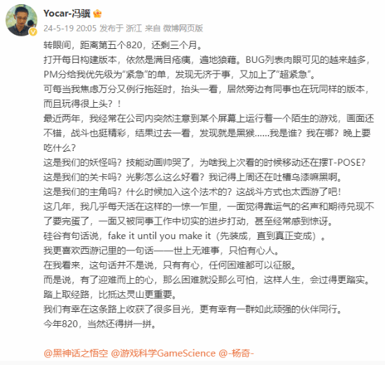 昨晚,游科创始人冯骥发文谈了《黑神话:悟空》的开发历程,称游戏这两年的进步很明显,今年820,当然还得拼一拼。主美杨奇表示:“九仞墙边绝路岐,人生全靠安慰剂。”