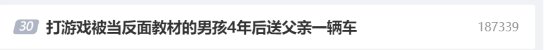 我们此前曾报道一名19岁游戏男孩赚钱后送父亲车的事例,而今日,话题“打游戏被当反面教材的男孩4年后送父亲一辆车”也登上了微博热搜。