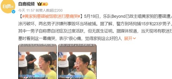 据白鹿视频报道,5月19日,乐队Beyond已故主唱黄家驹的墓碑遭人涂污破坏,两名男子涉嫌刑事毁坏当场被捕。