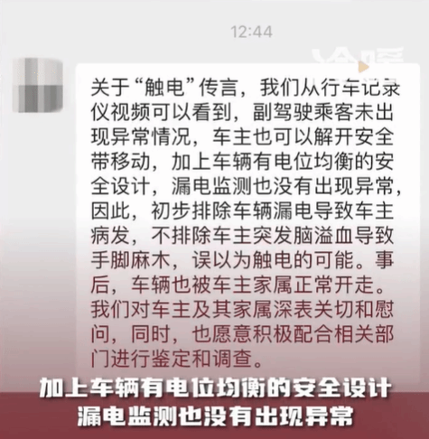 5月14日,比亚迪工作人员表示,关于“触电”传言,从行车记录仪视频可以看到,副驾驶乘客未出现异常情况,车主也可以解开安全带移动,加上车辆有电位均衡的安全设计,漏电监测也没有出现异常,因此,初步排除车辆漏电导致车主病发,不排除车主突发脑溢血导致手脚麻木,误以为触电的可能。
