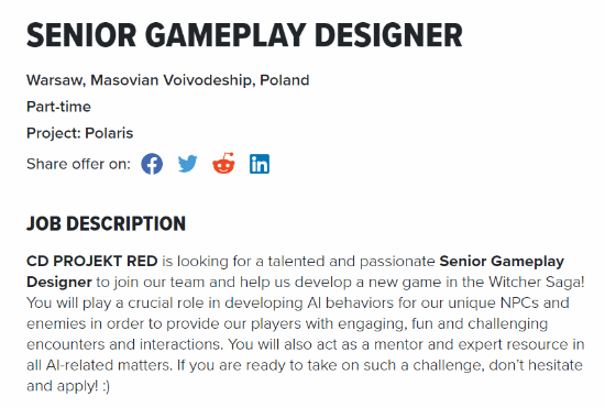 《巫师4》招募高级游戏设计师:负责创建先进的角色AI