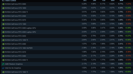 从Steam硬件调查图表来看,英伟达再次以76.59%的份额在PC平台中作为主导,而AMD的份额为15.79%,最后英特尔的份额为7.49%。