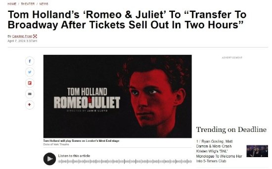 此前,汤姆·霍兰德、弗朗西斯卡·阿梅乌达-里弗斯主演伦敦西区舞台剧《罗密欧与朱丽叶》已经完成预演,且放出了全新的一批剧场照片,这些剧场照片在网络中引起热议。在社交媒体X中,有部分网友自制了一些关于荷兰弟与黑人女演员《罗密欧与朱丽叶》剧照的梗图,我们一起来欣赏一下。