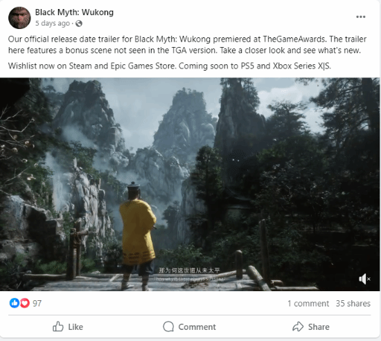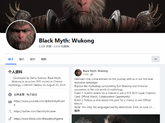《黑神话:悟空》官方Facebook账号已于近日正式开通,分享的内容主要是之前的宣传片,以及今天发布的海外活动。