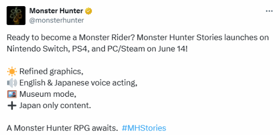今日卡普空正式宣布,此前在3DS与手机平台推出的《怪物猎人物语》将会在6月14日登陆PS4、Switch与PC平台。官方表示,此次的版本将会为上述平台带来精致的画面表现,同时包括英语和日语配音、博物馆模式以及一些仅限日本地区的内容。官方放出了最新宣传片,我们一起来欣赏一下。