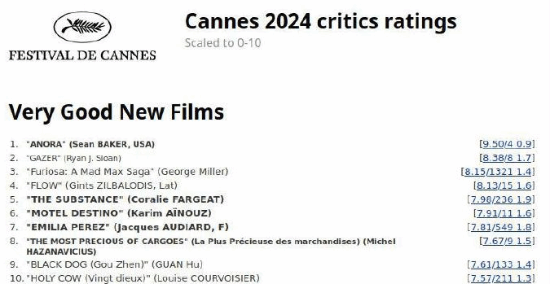 2024年第77届戛纳电影节现正火热进行中,管虎导演、彭于晏、佟丽娅等主演的电影《狗阵》在戛纳首映后,现位列戛纳口碑总榜实时第9名,截至目前211人参与评分,平均分达7.57分,分差1.3分。
