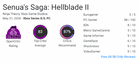 《地狱之刃2》媒体评测现已解禁,截至发稿,该作在OpenCritic网站的均分为83,媒体推荐度则为87%。目前收录58家媒体评分。