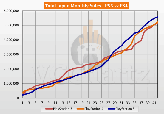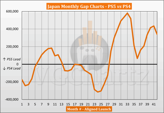 PS5在日本地区的第42个月是2024年4月,而对于PS4来说是2017年7月。在相同的时间范围内,PS5销售了558万台,而PS4销售了524万台。PS4在第45个月销售了与当前PS5销量相当的数量。