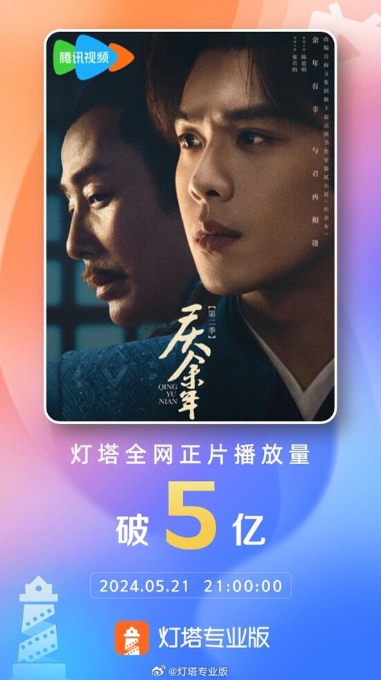 据灯塔专业版实时数据,截止21日21:00,《庆余年2》累计正片播放量突破5亿。