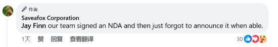 而有趣的是,当网友感叹为什么自己现在才知道这回事时,Saveafox Corporation表示,团队签署了保密协议,但是忘记了协议到哪天截止,现在才想起来公布。