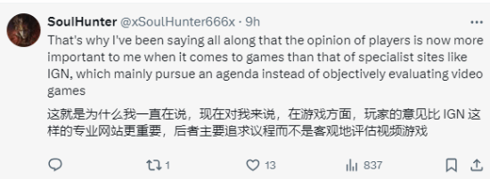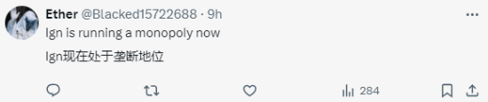 网友吐槽IGN现在处于垄断地位。还有人表示:这就是为什么我一直在说,玩家的意见对我来说比IGN等专业网站更重要,IGN主要是追求一个议程,而不是客观地评测电子游戏。