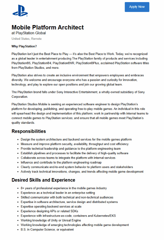 据外媒TweakTown报道,继此前微软Xbox计划在今年推出移动游戏商店后,近日根据索尼的一份最新招聘信息显示,索尼也正在开发PlayStation移动端的商店平台,我们一起来看一下招聘信息。