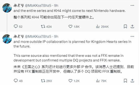 她表示,未来《王国之心》系列还计划进行更多外部IP合作(不仅是SE自家IP),其消息人士还提到《最终幻想10》重制版目前不存在,但他确认了多个《勇者斗恶龙》项目和《最终幻想9》重制版。