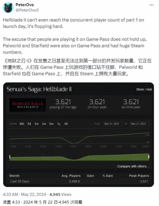 《地狱之刃2》已于昨日正式在Steam发售,首发加入XGP。有博主发文表示,其Steam玩家数不尽人意,发售之日的玩家数甚至不及第一部。