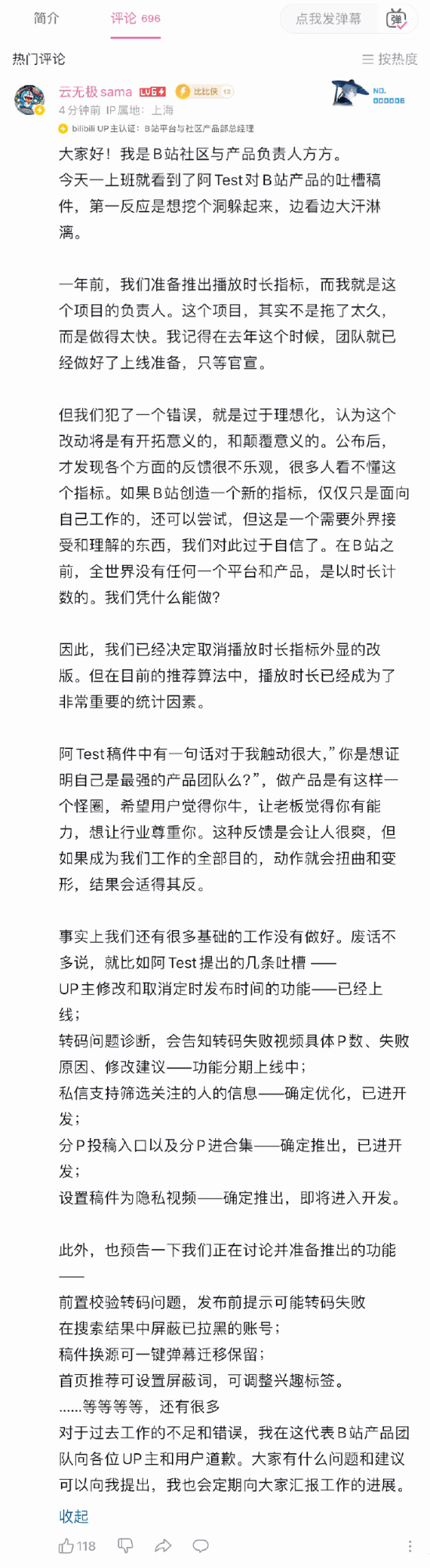B站全面取消播放量显示遭吐槽 负责人道歉:计划中止
