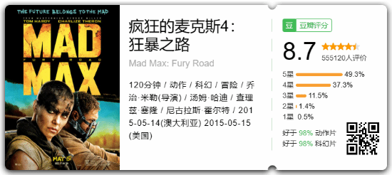 该电影的前作《疯狂的麦克斯4:狂暴之路》在豆瓣中的评分为8.7分,目前共有555120人参与评价,其中给予5星和4星的影迷居多,分别为49.3%与37.3%。被评为豆瓣电影Top250之一。