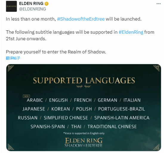 《艾尔登法环:黄金树幽影》新剧情预告发布后,开发商FromSoftware确认该DLC发布时将支持15种语言。