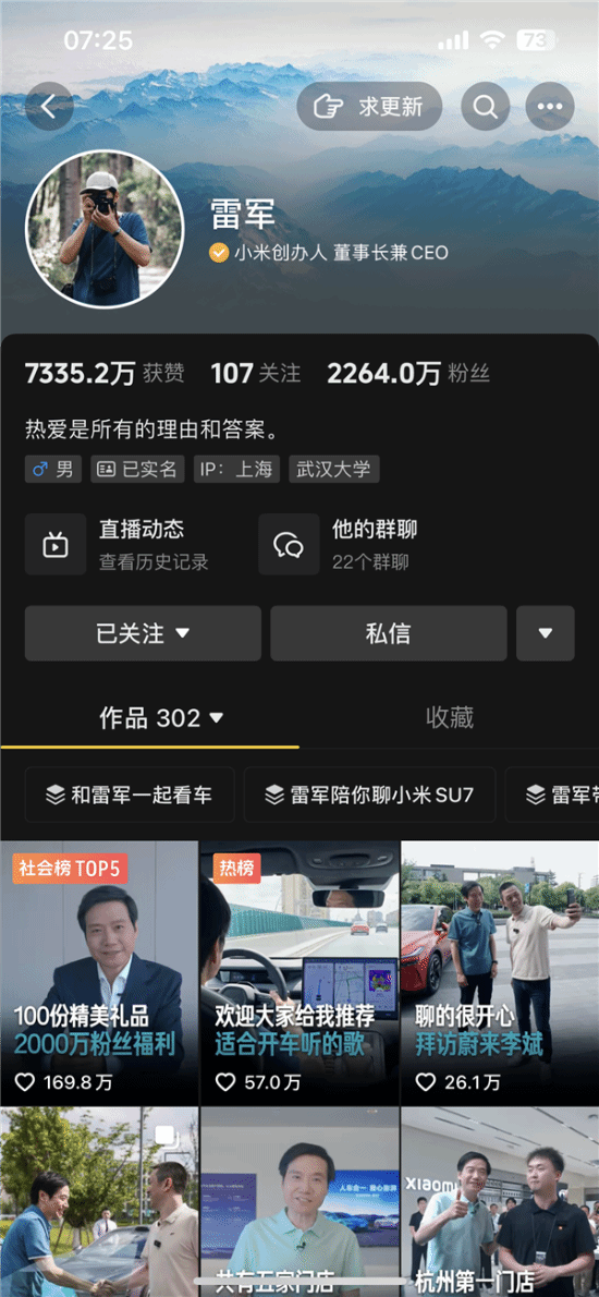 据悉,自3月28日小米SU7发布以来,雷军在该短视频平台发布了66条视频,开启5场直播,账号粉丝量增长近700万,其中4月涨粉近475万,在短视频达人涨粉月榜中位列第一。而发布新视频仅过一天,5月23日早7点,雷军的抖音账号粉丝数量已经达到了2264万,一天就涨了近200万。