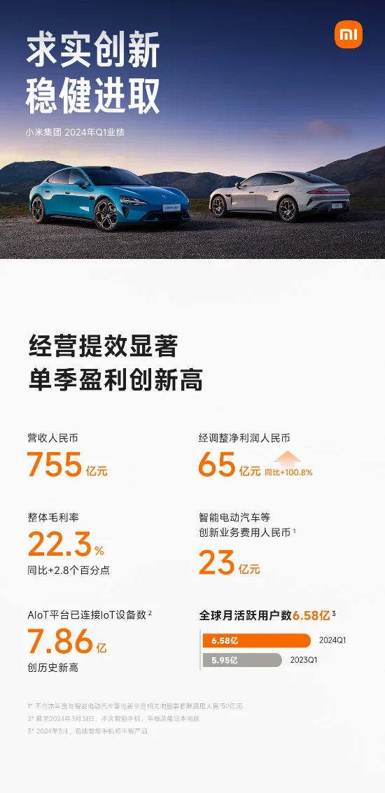 5月23日,小米集团发布2024年Q1业绩报告。2024年Q1,小米步入增长快车道,业绩表现超出市场预期:总营收人民币755亿元,同比增长27.0%,连续两个季度同比实现两位数增长;经调整净利润达人民币65亿元,同比增长100.8%,创单季历史新高;集团毛利率22.3%,同比提升2.8个百分点,环比提升1个百分点。