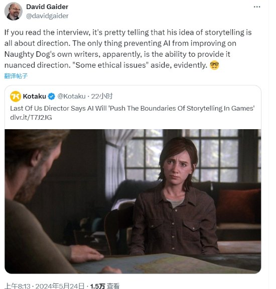 David Gaider(代表作《龙腾世纪》):如果你读过这次采访,就会发现他的叙事理念完全围绕在导演方面。显然,唯一阻碍AI超越顽皮狗自己编剧的,似乎只是提供给AI细致指导的能力。当然,“一些道德问题”也在其中。