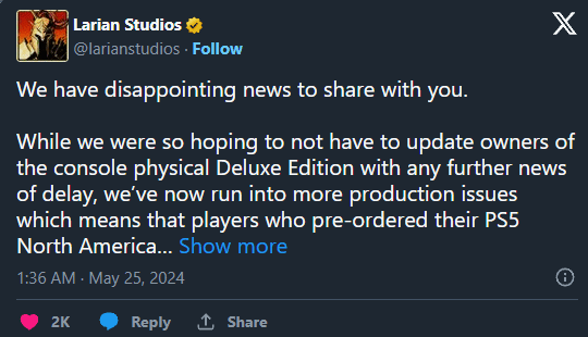 拉瑞安还表示其正在与制造商进行谈判,“以了解是否有可能雇佣额外的临时员工来缩短制作时间”。与此同时,拉瑞安也对延迟发售表达了强烈的歉意。