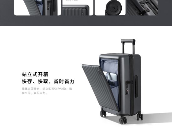 小米推出了新款米家前开盖20英寸登机箱,定价为449元。该款行李箱采用创新的前开盖设计,使箱盖在箱体站立状态下也能轻松开启,便于快速存取物品。