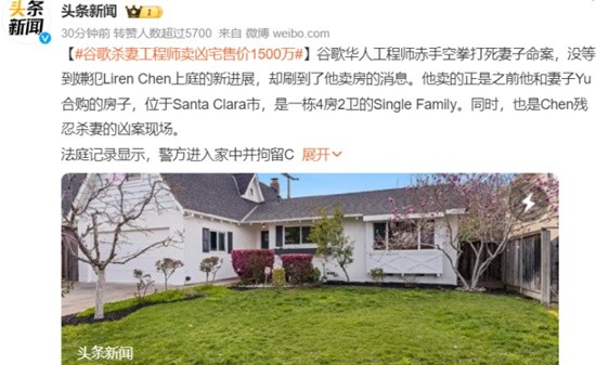 据头条新闻报道,谷歌工程师赤手空拳打死妻子命案,没等到嫌犯Liren Chen上庭的新进展,却刷到了他卖房的消息。