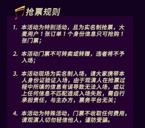 据抢票规则,该场演出将采取实名制抢票,1张订单1个身份信息只可抢购1张门票。入场时也将采取实名制入场,需持本人身份证验证入场。
