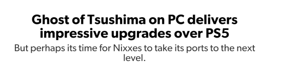 Sucker Punch的《对马岛之魂》由Nixxes Software负责移植,数毛社认为该团队的打磨质量整体上令人满意,PC端的图形等关键部分都具备有意义的升级,例如树叶绘制距离、图像质量、阴影质量、性能改进、更高的帧率等等。不过,游戏也存在着一些问题,比如受部分的视角问题影响,可能导致运动更新与帧速率不同步;如果用新一代GPU但使用仅支持 PCIe 3.0 通道的旧主板的用户会因带宽问题出现帧率不稳定的情况。