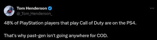 针对《使命召唤21:黑色行动6》将登陆上一代游戏机的消息,Tom Henderson解释称目前48%的PS端《使命召唤》玩家用得都是PS4,这就是原因所在。