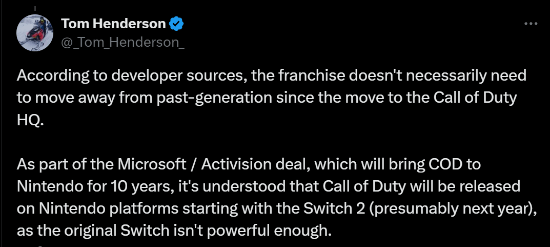 近日,知名爆料人Tom Henderson发文,透露微软正计划为任天堂下一代游戏机Switch 2带来《使命召唤》,预计首款就是最新公布的《使命召唤21:黑色行动6》。
