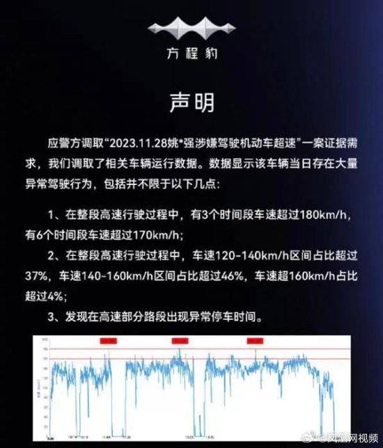 对此,比亚迪方程豹汽车方面应警方需求调取了该车主在相应路段的相关数据,数据中包含了该车辆在整段高速行驶过程中存在的3个时间段车速超过180km/h,6个时间段车速超过170km/h等等异常指数,并质疑该车主在高速路段存在“多次超速和异常停车”等行为。