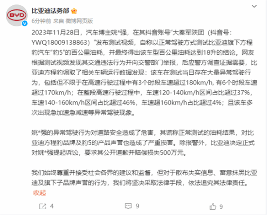 方程豹豹5百公里18升油后续:比亚迪索赔500万