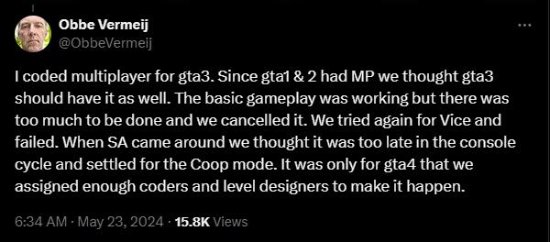 在X平台上,R星前开发者Obbe Vermeij透露道,他曾经为《GTA3》编写了多人游戏模式,因为当时团队认为“既然《GTA1》和《GTA2》有多人游戏,《GTA3》也应该有”。不幸的是,尽管基本的游戏玩法是可行的,但由于工作量太大,项目的这一部分被取消了。