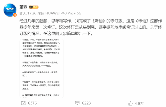 作者萧鼎从头到尾修订《诛仙》小说:填了一大波坑