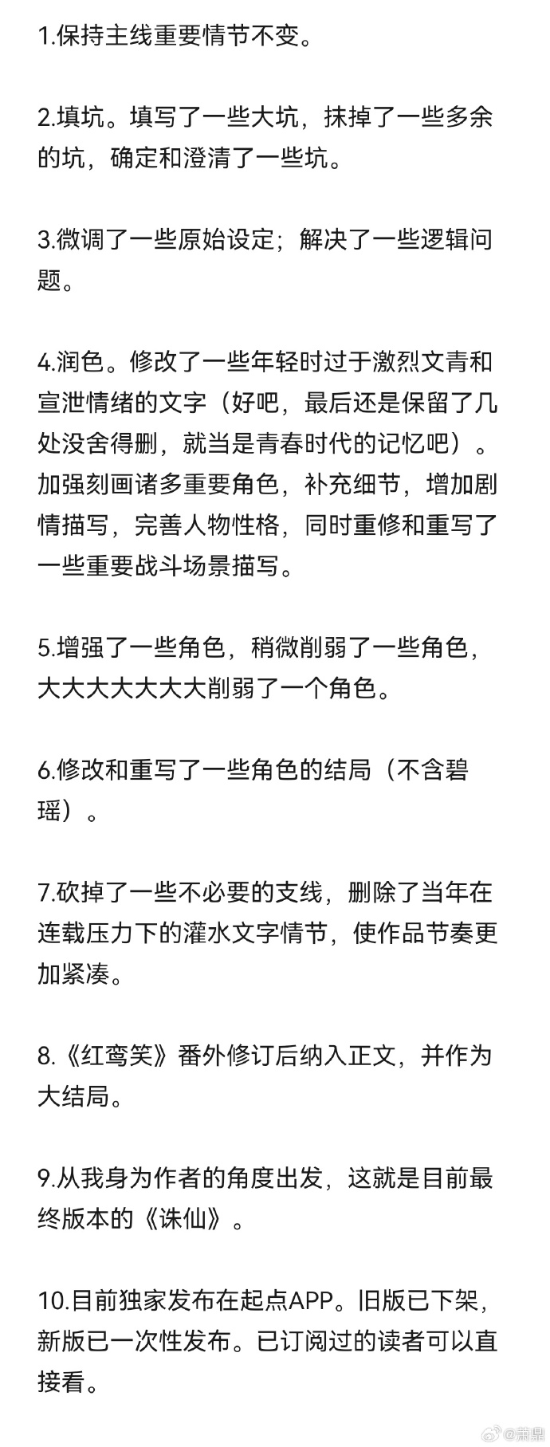萧鼎透露,这是《诛仙》这部作品多年来第一次修订。这次修订是从头到尾,逐字逐句地审阅修订过去的。自己对整部作品进行了逐字逐句的细致审阅和修改。