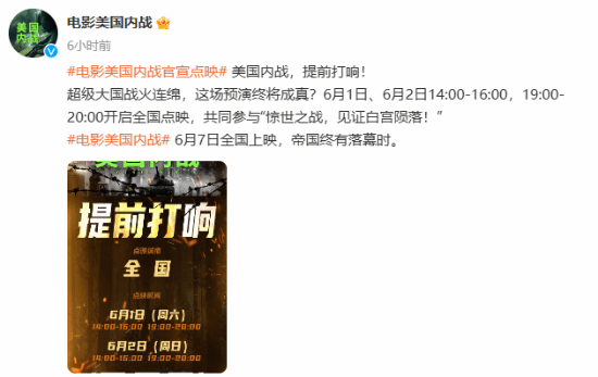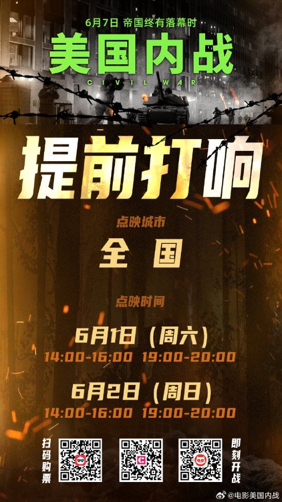 今日《美国内战》官方在微博中宣布,《美国内战》将于6月1日、6月2日开启全国点映!官方还放出了点映海报,我们一起来欣赏一下。