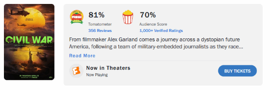 目前《美国内战》在烂番茄中的新鲜度为81%,电影将于6月7日在中国内地正式上映,敬请期待。