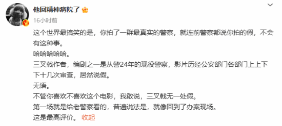 高群书表示:“这个世界最搞笑的是,你拍了一群最真实的警察,就连前警察都说你拍的假,不会有这种事。哈哈哈哈哈。三叉戟作者,编剧之一是从警24年的现役警察,影片历经公安部门各部门上上下下十几次审查,居然说假。无语。不管你喜欢不喜欢这个电影,我敢说,三叉戟无一处假。第一场就是给老警察看的,普遍说法是,就像回到了办案现场。这是最高评价。”