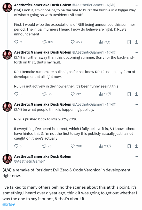 此前曾多次爆料过卡普空相关情报的Dusk Golem今日发文,公布了更多有关《生化危机》系列的情报。