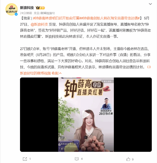 钟薛高林盛明日起开始卖红薯 将在直播带货还债
