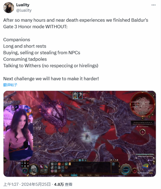Luality在X中发推表示:“经过这么多的时间游玩和濒死体验,我们完成了《博德之门3》的荣誉模式,但我们加入了几项超难的挑战:没有同伴、没有长休息和短休息、没有购买、出售或偷窃NPC、没有通过威瑟斯招募人员,甚至没有吃蝌蚪。”