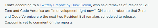 昨晚IGN更新文章,表示可以证实这两款游戏就是卡普空计划发布的下两部《生化危机》重制版。