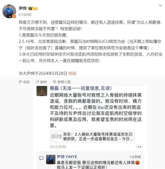 蔡磊表示:“近期网络大量账号对我恨之入骨般的持续抹黑造谣,连我的病都是装的。我没有时间、精力和能力应对。近期在ICU还没有出来时就迫不及待与尹烨总讨论渐冻症肌肉时空组学的科研新成果及应用,我希望宝贵的时间用在这里。”