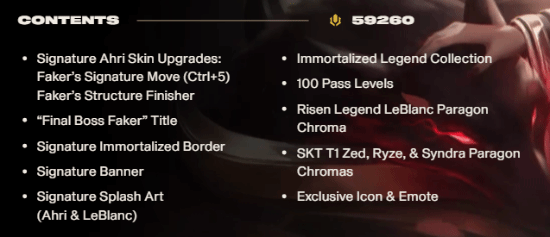 据官方文章显示,本次皮肤售卖共有三个档次,分别为5430 RP(约40美元 300元人民币)、32430 RP(约250美元 1800元人民币),最高档更是贵达59260 RP(约450美元 3200元人民币),其中包含通行证、多款限定纪念道具,例如英雄击杀特效、防御塔击杀特效、定制播报、皮肤形态切换、游戏内Ctrl+5的Faker招牌动作、“Final Boss Faker”头衔等等。